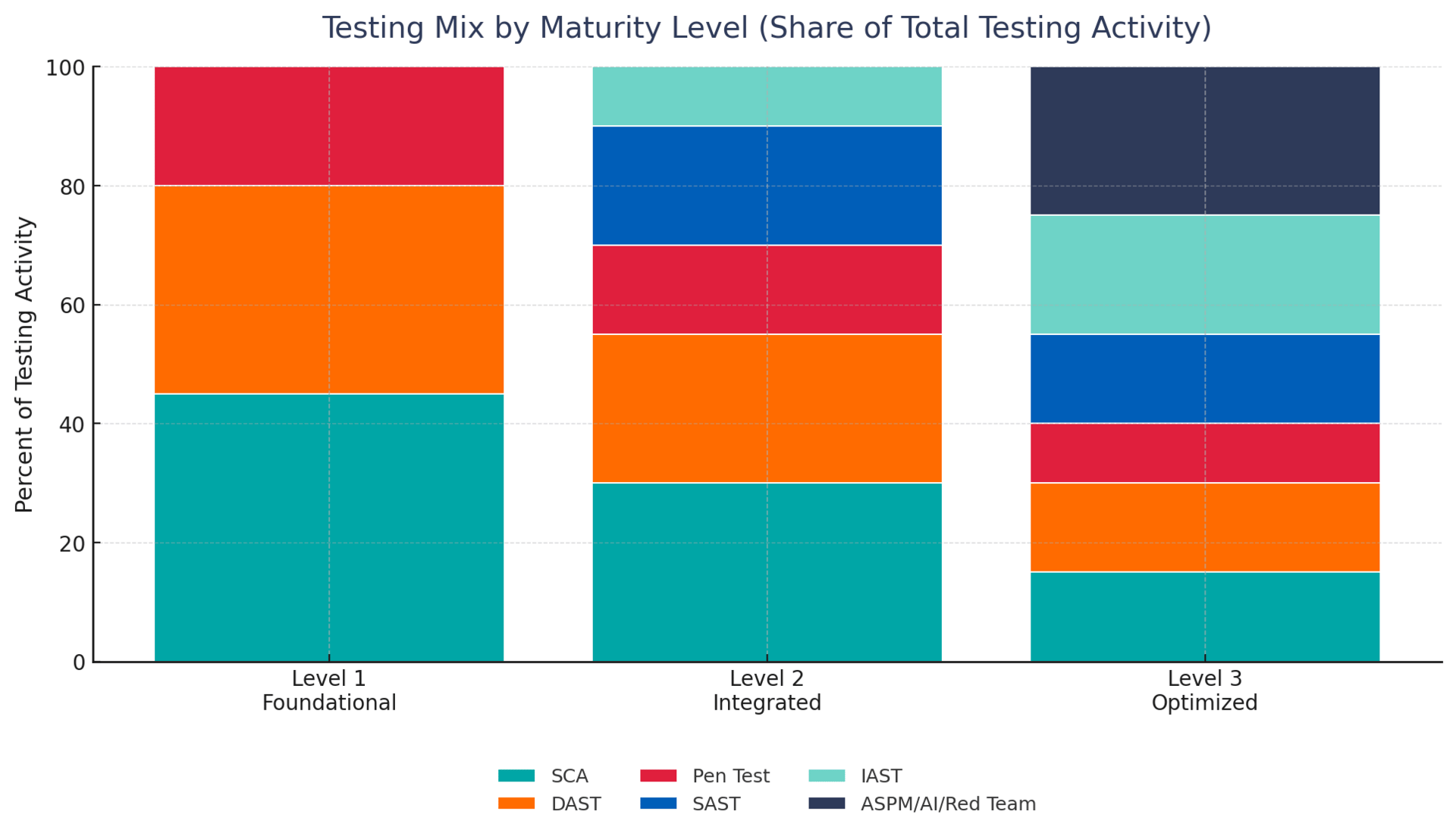 Organizations at foundational maturity (Level 1) should prioritize software composition analysis (SCA), dynamic application security testing (DAST), and external penetration testing - establishing visibility and addressing critical known vulnerabilities. Those at intermediate maturity (Level 2) must integrate static application security testing (SAST) into CI/CD pipelines, formalize threat modeling processes, and deploy interactive application security testing (IAST) in quality assurance environments. Advanced organizations (Level 3) should implement unified application security posture management (ASPM), continuous red teaming, and AI-enhanced testing with comprehensive automation and "break the build" policies.